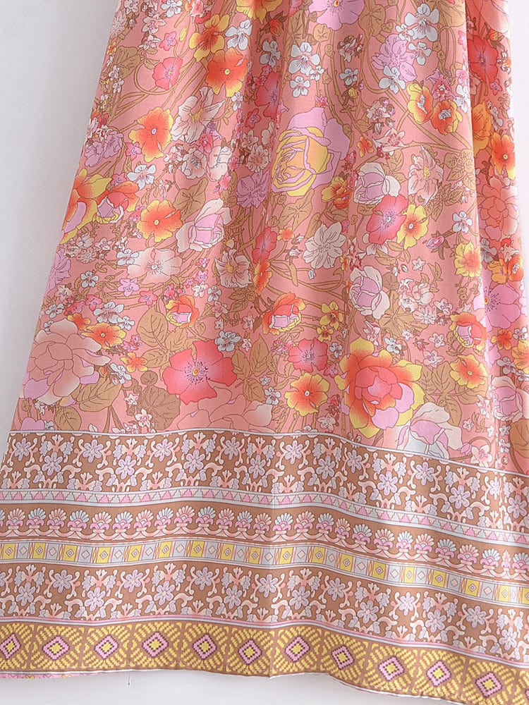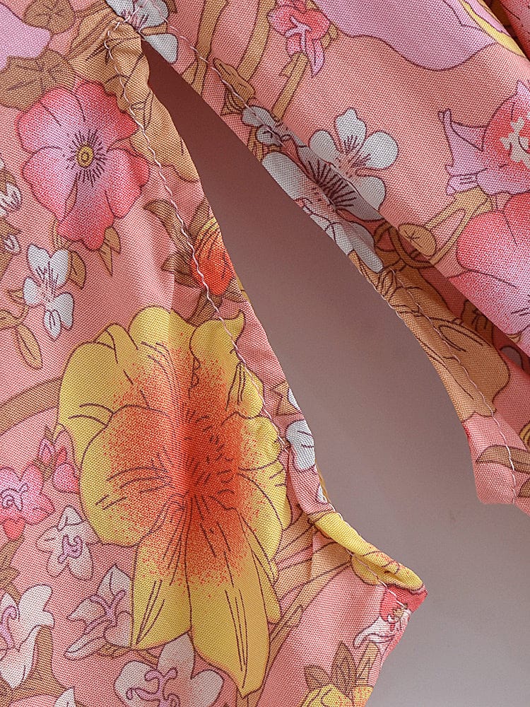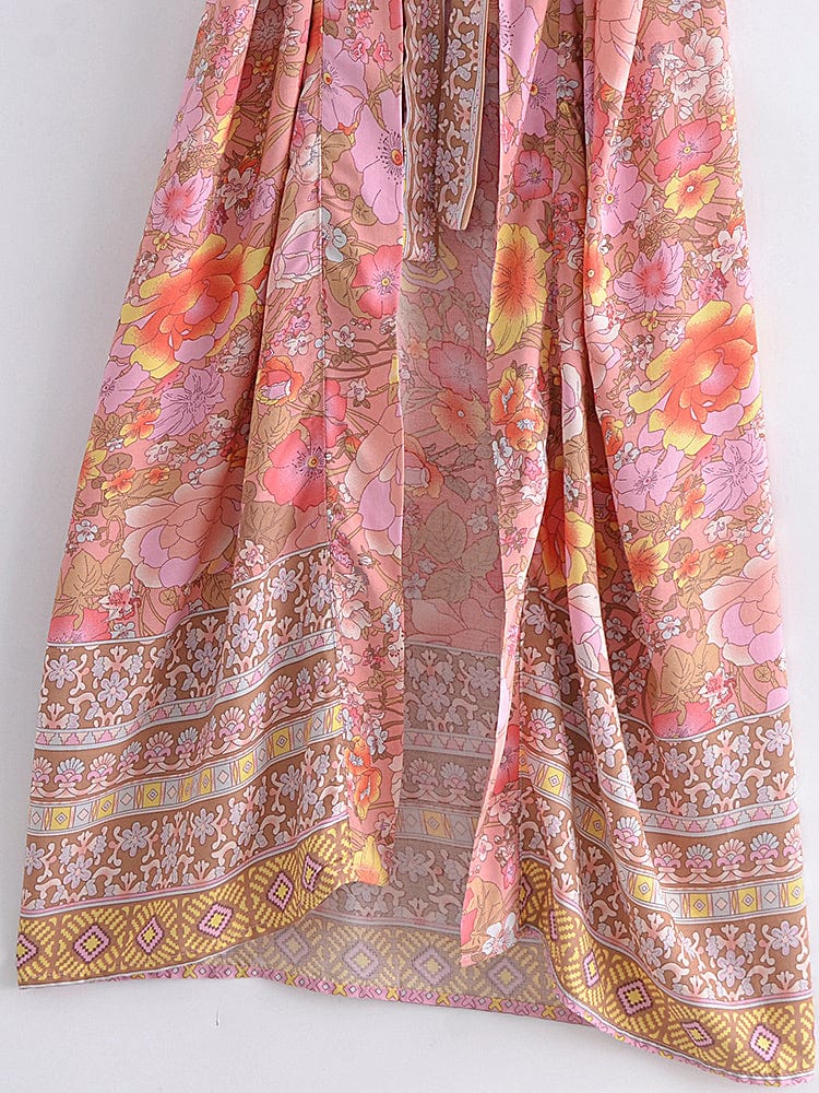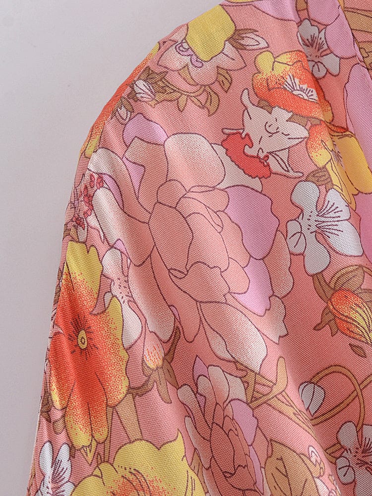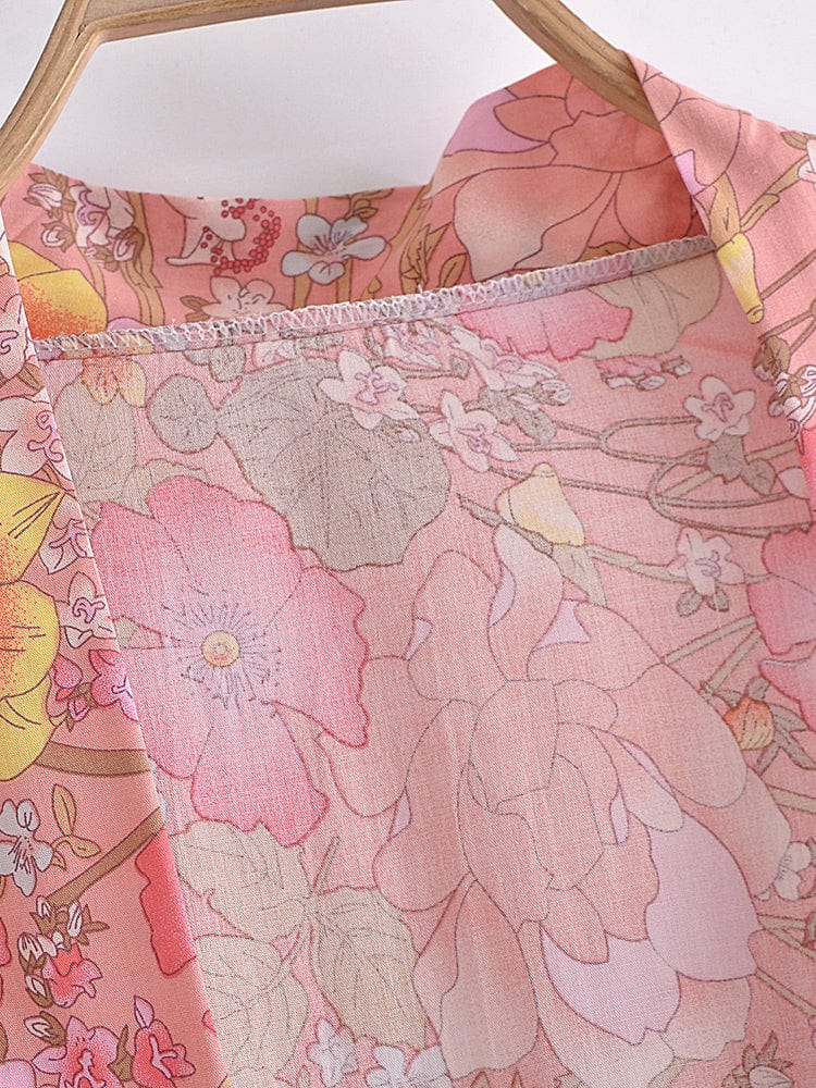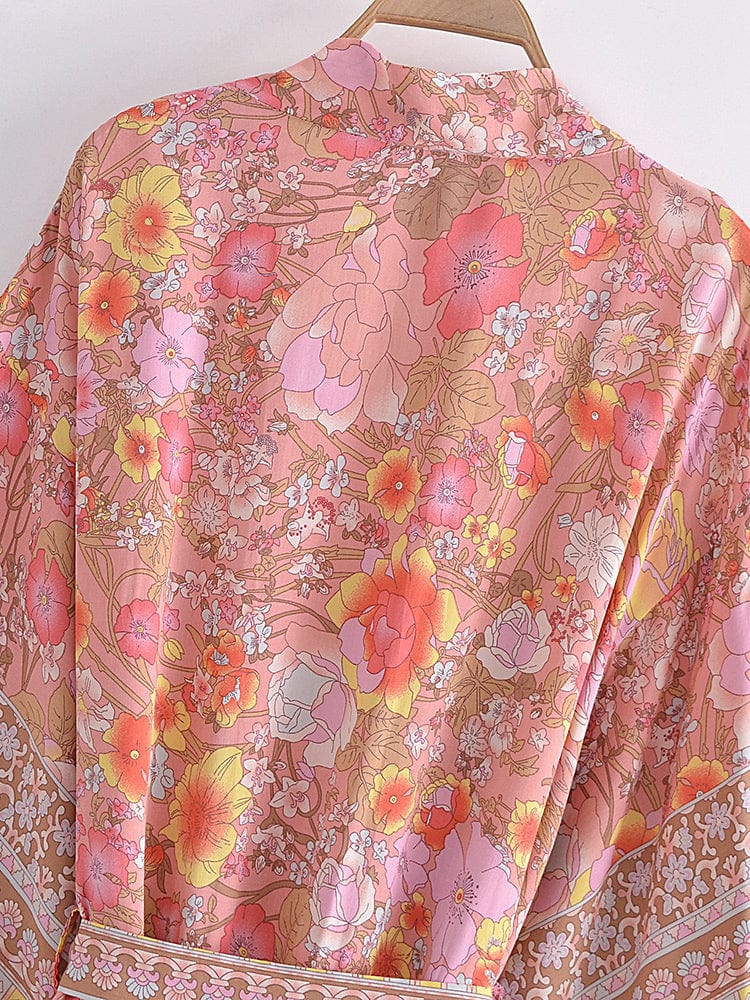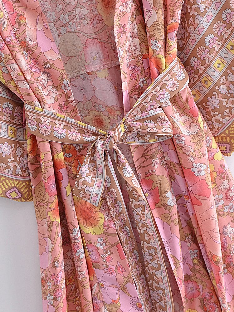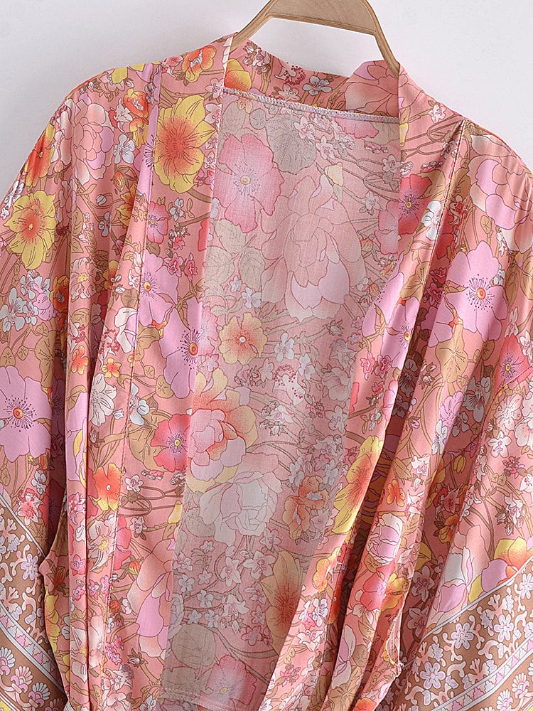 This kimono has a billowy, longline silhouette with a blended?bohemian-inspired floral print and a front tie clasp, making it a gorgeous boudoir staple.