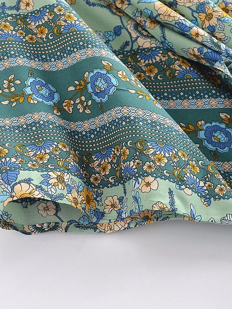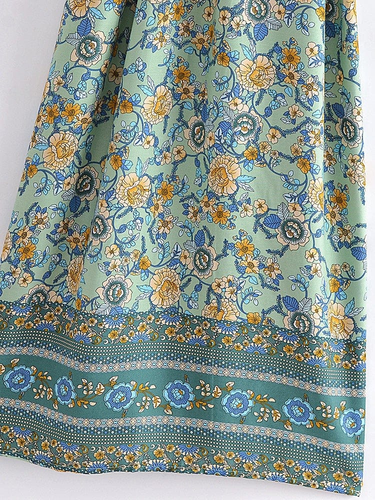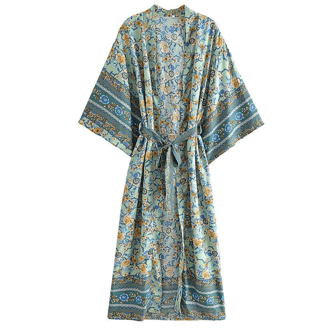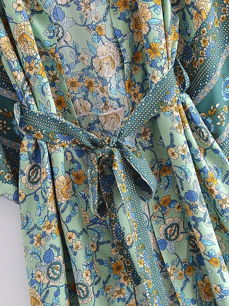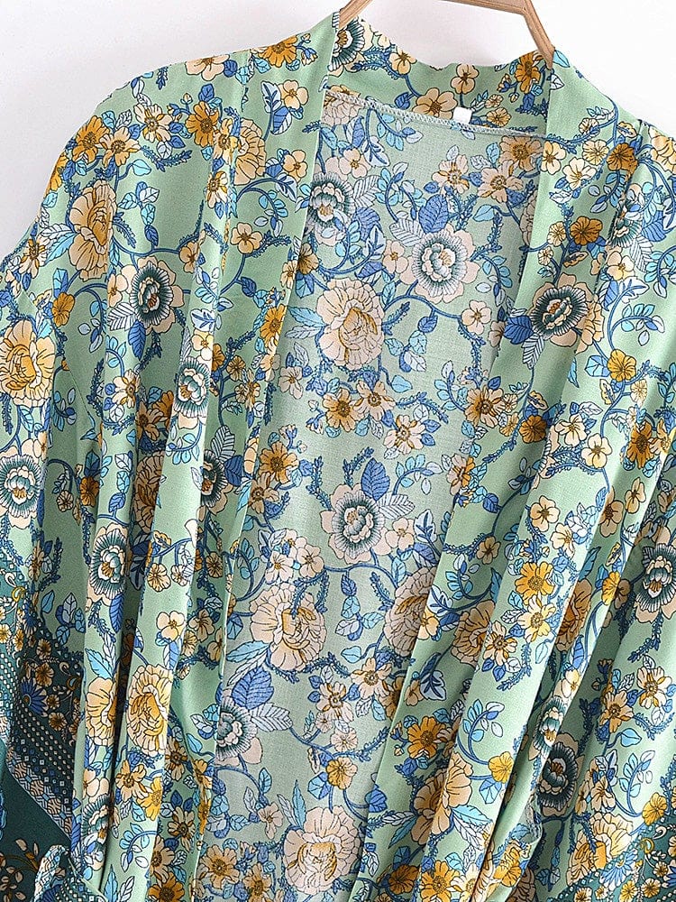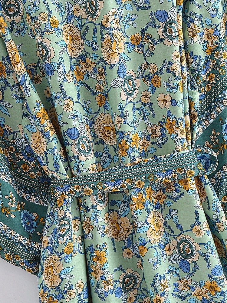 A green floral?motif adorns this?soft and lightweight kimono. This striking piece will add style to any outfit.