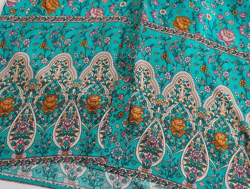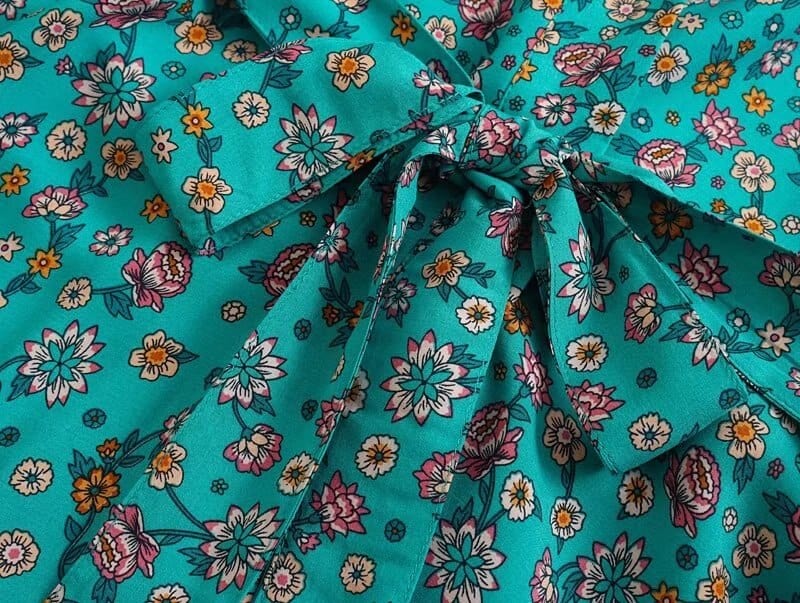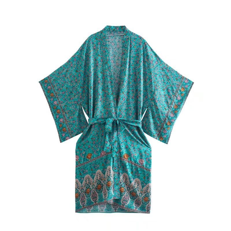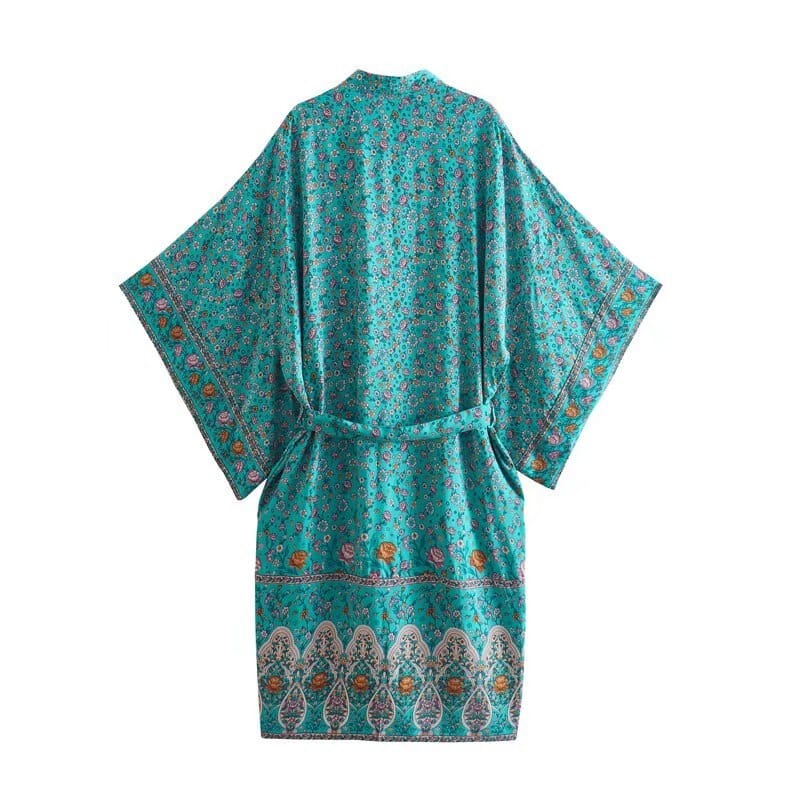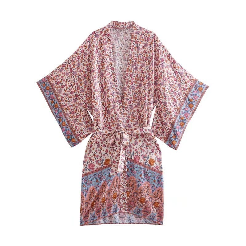 This lightweight Maera Boho Kimono is decorated in a lively floral pattern, that shapes an open-front design, with a set of adjustable matching sash ties that cinch at the waist